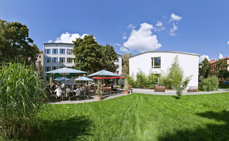 El hotel es el edificio más espectacular del campus, protegido como monumento y conocido en Berlín. El hermoso edificio de estilo neorrenacentista fue construido en 1902 como una casa de baños públicos, más sobre arquitectura e historia.